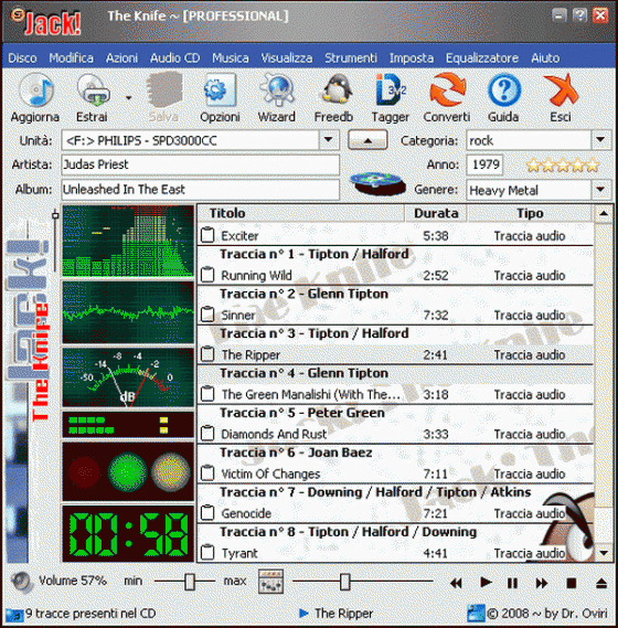Jack! The Knife - это не просто CD-риппер, а по-настоящему полный инструмент для создания и управления музыкой на вашем компьютере. Фактически, кроме извлечения треков с Audio CD дисков и сохранения их в ваших любимых музыкальных форматах, благодаря своим неисчислимым функциям, он позволяет Вам редактировать, конвертировать, нормализовать громкость, вырезать, соединять и анализировать ваши звуковые файлы вкупе с креативным увлекательным интерфейсом, действительно элементарно простым в использовании.