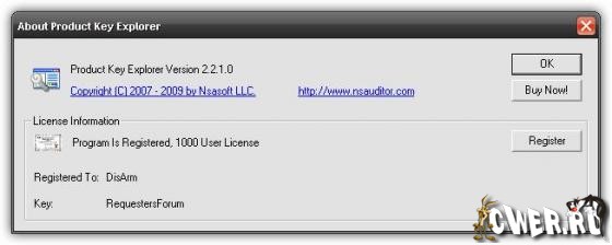 Product Key Explorer позволяет расшифровать и увидеть, а также сохранить серийные номера (Product ID, Product Key, License Info, User Name, Company) продуктов Microsoft, CD-key установленных на компьютере программ, и не только их. Неполный список ПО, регистрационные данные которых можно увидеть и сохранить: Micrsoft Windows (2000, XP, 2003, Vista), Microsoft Office 2003, Microsoft Office 2007, Microsoft Office XP, Micrsoft Visual Studio 2005, Macromedia, Ahead Nero, Adobe Photoshop, CyberLink PowerDVD, Borland Delphi и т.д.