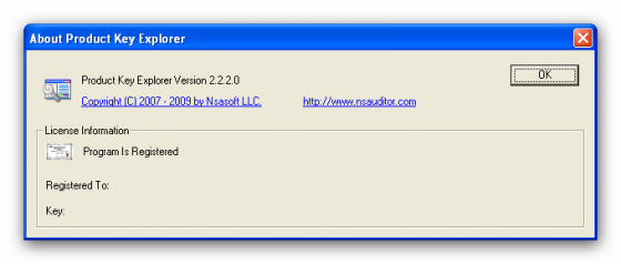 Product Key Explorer позволяет расшифровать и увидеть, а также сохранить серийные номера (Product ID, Product Key, License Info, User Name, Company) продуктов Microsoft, CD-key установленных на компьютере программ, и не только их. Неполный список ПО, регистрационные данные которых можно увидеть и сохранить: Micrsoft Windows (2000, XP, 2003, Vista), Microsoft Office 2003, Microsoft Office 2007, Microsoft Office XP, Micrsoft Visual Studio 2005, Macromedia, Ahead Nero, Adobe Photoshop, CyberLink PowerDVD, Borland Delphi и т.д.