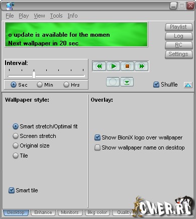 BioniX Wallpaper предоставляет пользователю возможность составления своего плейлиста картинок, которые будут устанавливаться в качестве обоев через выбранный промежуток времени (от нескольких секунд до 59 часов), при загрузке Windows или при выходе из программы. В качестве обоев можно устанавливать многие графические форматы (JPEG, GIF (статичные и анимационные), BMP, ICO, WMF, EMF и другие), а также видео файлы AVI. BioniX Wallpaper позволяет сохранять и открывать плейлисты, благодаря чему можно создать несколько плейлистов с изображениями на определенную тему и быстро переключаться между ними. Программа может показывать картинки в качестве скринсейвера, присутствует поддержка сменных визуальных тем (скинов) и возможность добавления картинок в плейлист методом Drag&Drop.