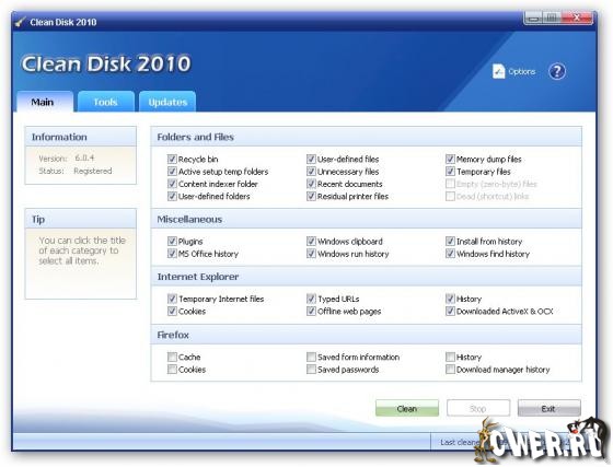 Clean Disk 2010 - это оптимизация системы. Поможет Вам поддержать свою систему, функционирующую при ее работе, удаляя ненужные файлы из Вашего компьютера, такие как инсталляционный остаток программ, решая проблемы DLLs, решая ошибки регистрации системы, и любые другие вещи, которые могут сделать Вашу систему медленнее и непостоянной.