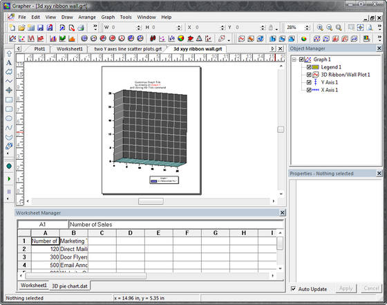 Grapher - мощный и простой в использовании графический пакет, позволяющий быстро создавать высококачественные графики. Программа позволяет строить более 54 видов двухмерных и трёхмерных графиков. Кроме того, вы можете настраивать любую часть графика или создавать свои собственные графики, наилучшим образом описывающие ваши данные. Программа содержит 4 типа двухмерных графиков: линейные, столбчатые, полярные и специальные. Все эти типы графиков доступны и в трёхмерном исполнении. Если вам требуется отразить дополнительную переменную, вы можете воспользоваться графиками 3D XYZ, контурными картами или картами поверхности.