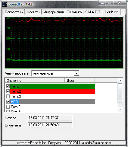 Основной изюминкой программы является регулировка оборотов вентиляторов в зависимости от условий (например, температуры процессора), но опять же, при наличии аппаратной поддержки со стороны оборудования. Кроме того, может собирать статистику по снимаемым параметрам и записывать сведения в log-файл, рисует графики изменения температур, напряжений и скоростей вращения вентиляторов. Ознакомиться со списками поддерживаемых сенсоров, материнских плат, позволяющих менять обороты вентиляторов, и жесткими дискам можно на официальном сайте