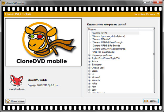 CloneDVD mobile — программа для конвертации DVD фильмов в форматы мобильных устройств. С помощью CloneDVD mobile вы сможете преобразовать DVD видео для просмотра на портативных устройствах, таких как Sony PSP, Apple iPod Video, iAudio X5, Creative Labs ZEN Vision, мобильных телефонов и многих других устройств. Также вы сможете конвертировать DVD фильмы в другие форматы, такие как DivX, XviD, AVI, MP4 и т.д. Таким образом, благодаря CloneDVD mobile вы сможете смотреть ваши любимые DVD фильмы или ТВ передачи в любое время и в любом месте на одном из ваших портативных устройств. Например, вы можете так конвертировать любимые мультфильмы ваших детей для просмотра на мобильном устройстве и они смогут смотреть свои мультики прямо в машине. Копирование DVD фильмов в мобильные форматы происходит всего за несколько кликов без необходимости в копировании видео на ваш жесткий диск. CloneDVD mobile обладает многоязычным интерфейсом с поддержкой русского языка.