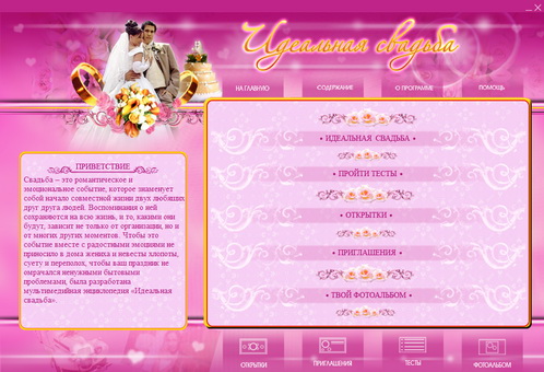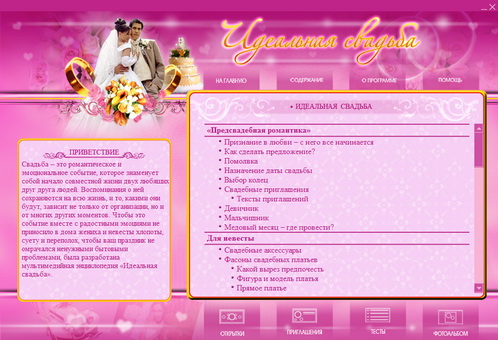 Чтобы ваш праздник не омрачался ненужными бытовыми проблемами и прошел именно так, как вы хотите, была разработана мультимедийная энциклопедия "Идеальная свадьба".