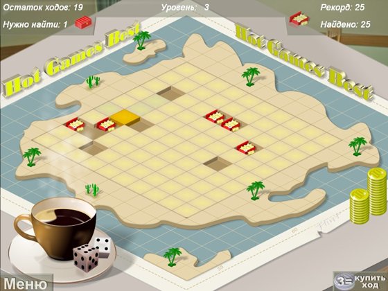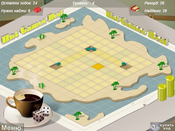 Это маленькая игра с очень простыми правилами. Игроку нужно найти спрятанные на острове сокровища. Для этого просто наводите курсор на место предполагаемого клада и нажимайте мышку. В некоторых местах будут появляться стрелки – подсказки, следуйте их указаниям, и вы обязательно доберетесь до цели! Просто? Но это не все, количество ходов ограничено, поэтому прежде чем сделать ход подумайте и проанализируйте обстановку. И это не все! Дальше на островах растут деревья, и наша задача усложняется.