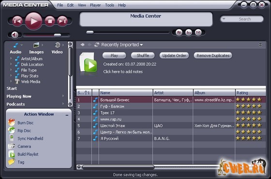 Мультимедийный центр (раньше назывался Media Jukebox). Проигрывает большинство популярных аудио и видео форматов, включая MP3, аудио CD (поддерживает CDDB) и DVD, может преобразовывать CD-аудиотреки в WAV и MP3, переписывать на жесткий диск виниловые диски и кассеты (убирая при этом помехи и шумы), а также создавать аудио-CD, причем для всех этих функций программа имеет множество настраиваемых параметров. Кроме этого, есть очень хороший и мощный по своим возможностям органайзер мультимедийных файлов, медиаредактор, эквалайзер, встроенный DSP и удобный планировщик заданий для автоматизации процесов проигрывания/записи, а также поддержка пульта ДУ. Из необязательных, но приятных функций - становящаяся уже почти стандартом для "приличных" программ возможность изменения внешнего вида с помощью скинов, мини-режим проигрывателя и "телевизор" (c картами ATI).