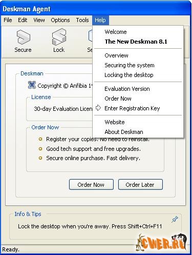 Anfibia Deskman – программа для ограничения или запрета на допуск к портам, запуска или изменения жизненно важных или прикладных составляющих системы от неопытного или со злыми намерениями пользователя. Область применения довольно широка: как средство блокировки компьютера на время отсутствия, как многоплановый инструмент для ограничения доступа пользователей к изменению критически важных настроек компьютера, и апплетов управления. Для удобства имеются готовые профили безопасности.