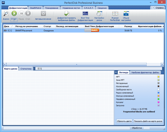Raxco PerfectDisk - программа для дефрагментации жесткого диска, которую можно бесплатно скачать на cwer.ws. Во время своей работы оптимизирует файл подкачки, MFT-таблицу, а также физическое расположение файлов и директорий на жёстком диске. Для того чтобы начать дефрагментировать какой-либо диск, нужно выбрать сам диск и нажать кнопку запуска. При своей работе программа показывает изменяющуюся графическую таблицу, в которой в реальном времени отображается процесс дефрагментации.