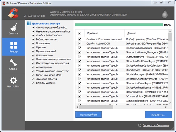 - Чистка и оптимизация реестра. Встроенный в программу чистильщик реестра позволяет проводить диагностику, выявляя проблемы и определяя неиспользуемые записи. Удаляются неиспользуемые расширения файлов, элементы управления ActiveX, ClassID, ProgID, общие библиотек DLL, ссылки на удаленные из системы шрифты, файлы справки, иконки, неверные ярлыки и многое другое.