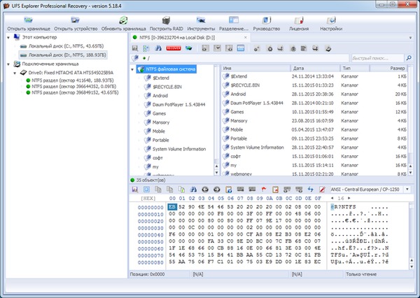 - NTFS: полная поддержка (доступ к данным и все возможности восстановления).
