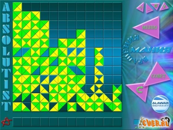 Логическая игра, которая представляет интерес для настоящих поклонников головоломок. Впереди вас ждет множество непростых задачек, которые можно решать в любом из 3 игровых режимов. На игровом поле располагется множество квадратов, состоящих из разноцветных треугольников. При помощи мышки поворачиваете квадраты таким образом, чтобы в итоге соединить как минимум 4 треугольника одного цвета в фигурку произвольной формы.