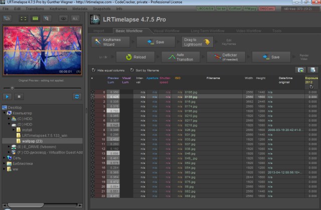 LRTimelapse - программа для редактирования покадровой съёмки (time lapse), ключевых кадров, градации и рендеринга. Независимо от того, какая камера используется LRTimelapse не будет принимать ваши временные результаты покадровой съёмки на следующий уровень. Программа будет полезна фотографам для обработки интервальных съемок (timelapse, цейтраферная съемка) и получения видеоролика.