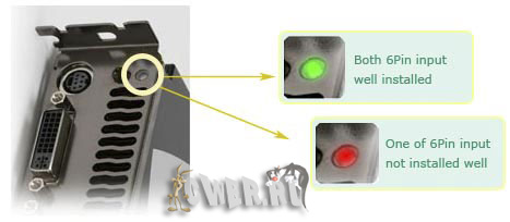 Примечательно и то, что разработчики снабдили своё детище весьма полезной функцией Smart Power Input Identifying. Суть её заключается в наличии у видеокарты на задней панели особого индикатора, который горит красным цветом, если подключение предназначенных для организации дополнительного питания двух 6-контактных разъёмов произведено неправильно, и светится зелёным, когда оба коннектора подсоединены как надо.