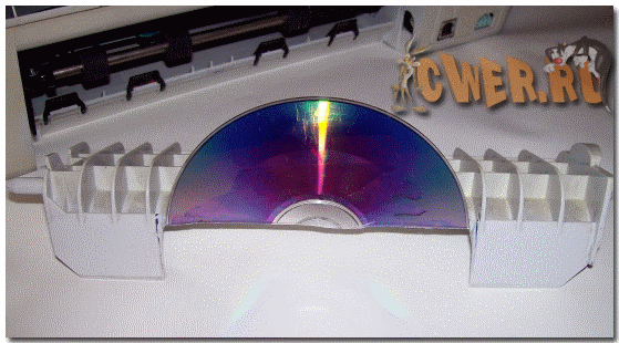 В образовавшийся вырез вклеить половинку диска. Это будет работать как столик для подачи дисков и ориентир положения диска