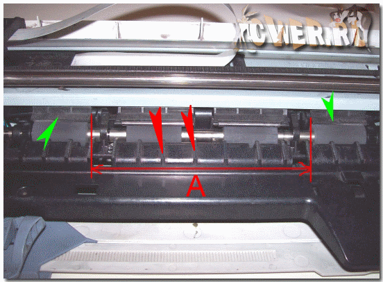 С целью увеличения размера «А» до 125 мм., у боковых прижимных механизмов (отмечены зелёным) удалить металлические ролики, так-же у средних механизмов необходимо заменить пружины на более мягкие. Ряд зубчиков отмеченных красными стрелками удалить кусачками и отшлифовать.