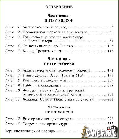 В книге подробно рассказывается о развитии английской архитектуры со времен сооружения стены Адриана до второй половины 20-го века. Авторы излагают историю создания церковных и светских зданий, особое внимание уделяя описанию архитектурных деталей.