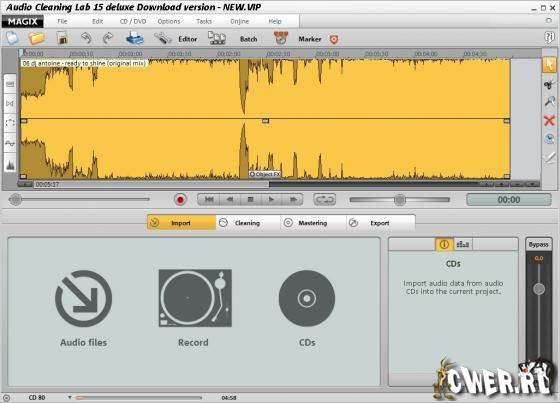 MAGiX Audio Cleaning Lab - мощный пакет для компилирования, чистки и управления звуковыми данными всех видов. Позволяет использовать источники звука различных типов: от магнитной ленты до пластинок и MP3. Дает возможность создавать компиляции с наложением эффектов высокого качества, очисткой и последующей записью на CD. С помощью этой программы можно очистить звук от треска, щелчков и шумов, а также записать очищенные данные на CD, защитив их тем самым от дальнейшего износа. Программа имеет множество алгоритмов очистки, а также компрессор, эквалайзер, расширитель стереобазы и другое. Позволяет подключать внешние DirectX плагины. Имеет удобный пользовательский интерфейс и простое управление.