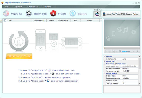 Отличный инструмент для конвертирования видео, с помощью которого можно конвертировать DVD в видео формат, поддерживаемый Apple iPod Movie и iPod Video (MP4) с быстрой скоростью конвертирования и превосходным качеством видео. Данный видео конвертер может преобразовать все типы видео файлов (avi, divx, xvid, flv, x264, vob, mpeg, DVD, YouTube, и т.д.) в надлежащие видео форматы (MPEG-4, H.264) для проигрывания на iPod.Также данным конвертером можно преобразовать видео для любого типа iPod, который проигрывает видео. Поддерживаются iPod, iPod touch, iPod nano и iPod classic в дополнение к 5-ому поколению iPod. Вы можете также преобразовать видео для iPhone.