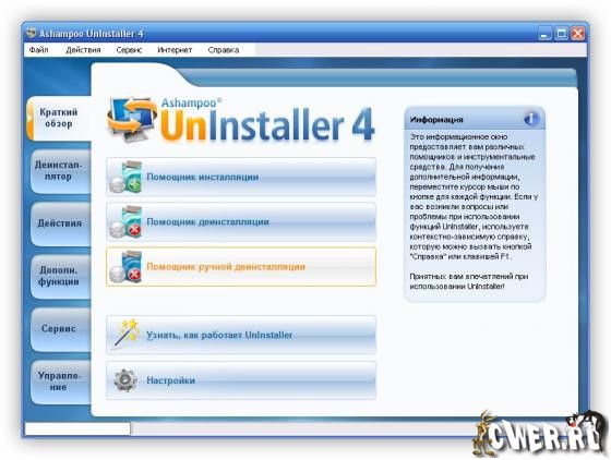 Ashampoo UnInstaller - деинсталлятор программ с прекрасно организованным интерфейсом и алгоритмом работы. Эта утилита отслеживает и регистрирует изменения, которые вносят инсталляционные программы, что позволяет при необходимости корректно удалить ненужную программу. Положительным качеством является то, что данная программа удаляет не только те приложения, что были отслежены ей, но и путем анализа деинсталлирует программы, мониторинг которых не производился. Кроме своей основной функции, программа способна удалять дубликаты и временные файлы, управлять установленными в систему шрифтами. Имеет стильный пользовательский интерфейс с мультиязычной поддержкой, включая поддержку русского языка.