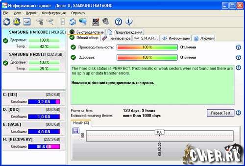 • Продвинутым пользователям пригодятся значения часов наработки и количество ошибок чтения/записи; интерпретирует значения производительности и состояния S.M.A.R.T. в процентный показатель для более простого понимания