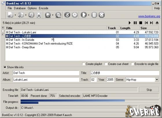 BonkEnc - программа для копирования аудиотреков в цифровой формат, а также для конвертирования аудиофайлов из одного формата в другой. BonkEnc поддерживает основные аудиоформаты - MP3, MP4/M4A, Ogg Vorbis, AAC, Bonk, FLAC и может работать с базой данных CD FreeDB.