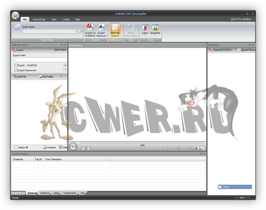 Sothink SWF Decompiler - программа для конвертирования SWF в FLA и извлечения из них различных ресурсов. С помощью утилиты можно извлекать звуки, изображения, сценарии, шрифты и многое другое из обычных Flash-роликов (SWF, EXE). Sothink SWF Decompiler позволяет конвертировать Flash-файлы в формате SWF в FLA. Программа также содержит инструмент SWF Catcher, который позволяет захватывать Flash-анимацию, просматриваемую в браузерах Internet Explorer или Firefox. Программа совместима со всеми SWF элементами, такими как ActionScripts, звуки, изображения, видео, формы, рамки, точки, тексты и кнопки в различных форматах. Программа может скопировать отрывок из видео файла Flash и вставить его в любой FLV формат. Интерфейс данного продукта логичен и прост в использовании.