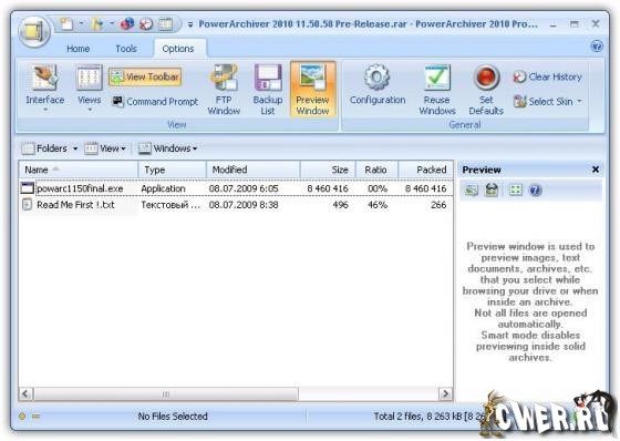 • Окно Просмотра - простой просмотр архивов, изображений, текста и файлов других форматов, без необходимости извлечения архива. Работает при просмотре файлов с диска и внутри архива. Поддержка WLX плагинов.