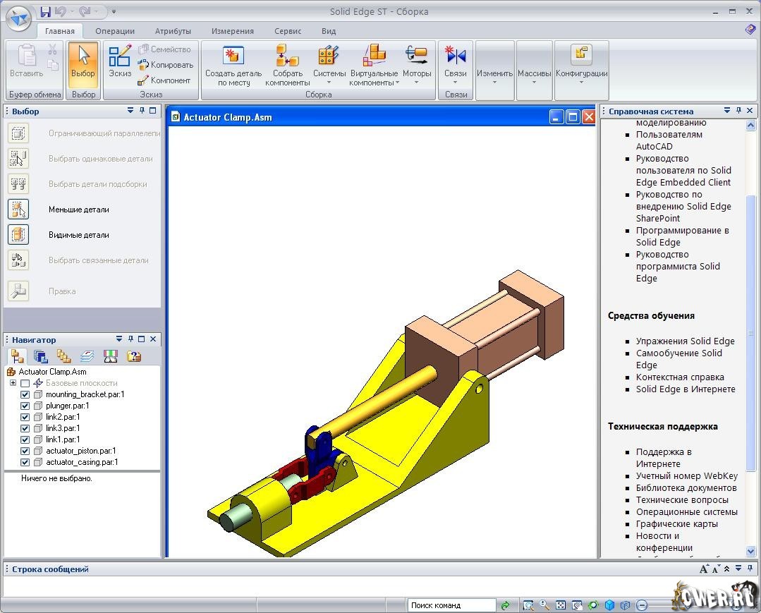 Solid Edge обеспечивает создание точных и безошибочных проектных решений за счет непревзойденных базовых функций моделирования и управления процессом работы конструктора, уникальной ориентированности на нужды различных отраслей промышленности и полностью интегрированной среды управления проектированием. Средства моделирования Solid Edge позволяют создавать самые различные проекты — от отдельных деталей до сборок, состоящих из тысяч компонентов. Специальные команды и организация процесса работы ускоряют проектирование элементов конструкции, специфичных для той или иной отрасли, при этом цифровая модель сборки, которую можно анализировать и редактировать, гарантирует корректное сопряжение и функционирование входящих в нее деталей.