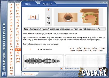 Своё произношение с эталоном можно сравнить не только на слух, но и визуально — с помощью графического отображения. Для тренировки интонации, ритма немецкой речи предлагаются скороговорки, которые можно прослушать в трехскоростном режиме звучания. К каждому звуку представлен анимированный ролик, на котором показано, как правильно произносить звук.