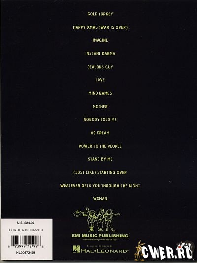 Полная музыкальная транскрипция 15 самых прекрасных песен Джона Леннона: Cold Turkey, Happy Xmas (War Is Over), Imagine, Instant Karma, Jealous Guy, Love, Mind Games, Mother, Nobody Told Me, #9 Dream, Power to the People, Stand by Me, (Just Like) Starting Over, Whatever Gets You Through the Night, Woman.