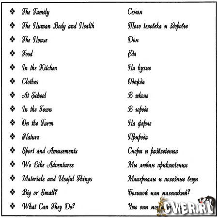 Развитию устной речи помогают упражнения по составлению несложных рассказов на английском языке. Для этой цели можно использовать центральную иллюстрацию книги, сопровождающий ее текст и приведенные в конце книги контрольные вопросы по теме. Во все книги серии включены таблицы, содержащие в адаптированном для детей виде элементы гpамматики английскоrо языка.