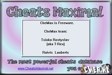 CheMax - наибольшая из известных на данный момент программ, которые являют собой базу данных с кодами для игр. Простой и красивый интерфейс, малый размер, и при этом огромное количество представленных игр. Особенностью базы является отсутствие в ней хинтов и прочей “отсебятины“, вашему вниманию представлены только коды (cheats, hex-cheats) и пароли (passwords).