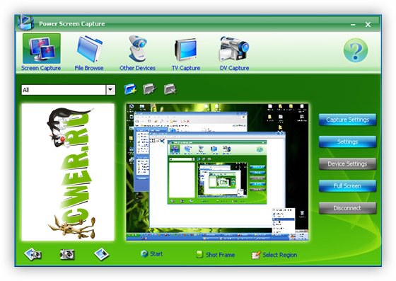 Power Screen Capture - мощная программа захвата всего что происходит на экране монитора с высоким качеством а так же захвата изображений с различных устройств типа DV видео и вэб-камер, TV тюнеров и прочих девайсов, в режиме реального времени. Возможна установка выходных параметром захваченного материла: видео и аудио кодеков, размер рамки и кадров в секунду и пр. Присутствует так же возможность нанесения водяных знаком и текстовых надписей.