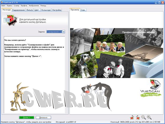 VueScan Pro - программа для работы со сканерами HP, Minolta, Nikon, Polaroid, Epson, Canon и другими. Может работать с внутренней глубиной цвета. VueScan поддерживает автоматическую и ручную настройку большинства параметров и пакетный режим сканирования. Поддерживается более 500 моделей сканеров с определенным перевесом в сторону слайд-сканеров — Nikon, Minolta, Polaroid, Microtek, Epson. Предусмотрено автоматическое удаление дефектов изображения за счет канала инфракрасного сканирования и многопроходное сканирование с последующим усреднением результата — для подавления собственных шумов сканера. Имеются фильтры подавления зерна, нерезкого маскирования и удаления паразитного оттенка оригинала. Есть средства ручной корректировки динамического диапазона и градационной характеристики (независимо по каналам R, G, B).