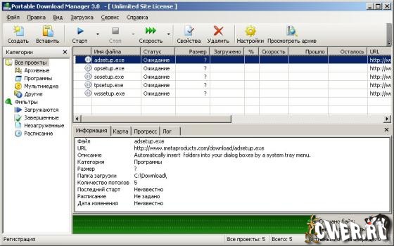 MetaProducts Portable Download Manager качает выбранные вами файлы (или список файлов) с Web, FTP и HTTPS сайтов, а также потоковое аудио/видео MMS, RTSP, MMST с максимально возможной скоростью. Технология разбиения файла на несколько фрагментов и одновременной работы над каждым из них существенно уменьшает время скачивания. Программа позволяет просмотривать содержимое RAR, ZIP архивов до загрузки и скачивать только выбранные файлы.