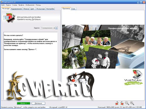 VueScan Pro - программа для работы со сканерами HP, Minolta, Nikon, Polaroid, Epson, Canon и другими. Может работать с внутренней глубиной цвета. VueScan поддерживает автоматическую и ручную настройку большинства параметров и пакетный режим сканирования. Поддерживается более 500 моделей сканеров с определенным перевесом в сторону слайд-сканеров — Nikon, Minolta, Polaroid, Microtek, Epson. Предусмотрено автоматическое удаление дефектов изображения за счет канала инфракрасного сканирования и многопроходное сканирование с последующим усреднением результата — для подавления собственных шумов сканера. Имеются фильтры подавления зерна, нерезкого маскирования и удаления паразитного оттенка оригинала. Есть средства ручной корректировки динамического диапазона и градационной характеристики (независимо по каналам R, G, B).