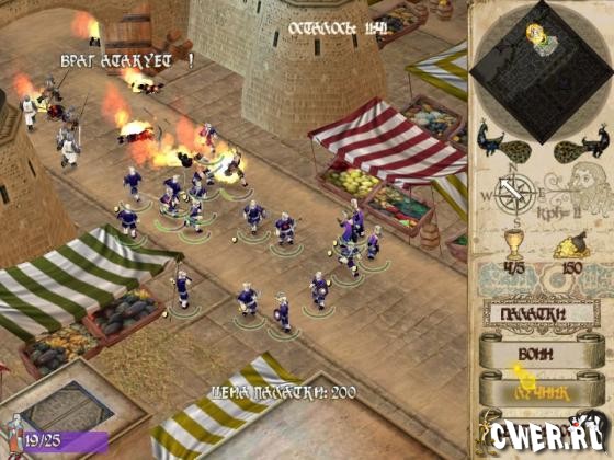 В путешествии за гробом Господним (да, мы участвуем в крестовом походе) от девелоперов нам досталось четыре типа юнитов: священники, пехота, лучники и, собственно, крестоносцы. У обороняющихся функциональный состав "армии" тот же, только названия другие. Воспроизводство происходит с завидной простотой. Достаточно найти на карте место, помеченное флажком, построить там тенты соответствующего типа, и оттуда в обмен на золото, словно из станции метро, станут вылезать солдафоны.
