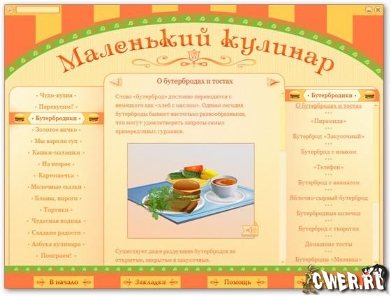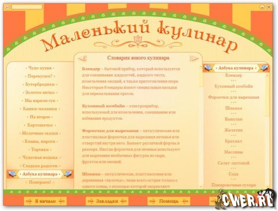 Готовить вкусно могут не только мамы и бабушки, у которых за плечами многолетний опыт! Мультимедийная энциклопедия «Маленький кулинар» поможет тебе постигнуть тайны поварского искусства. Ты научишься варить, жарить и печь самые разные блюда на каждый день и для праздничного стола, а также узнаешь, как правильно сервировать стол и украшать угощения. Кроме того, в энциклопедии есть встроенная флеш-игра «Кулинарный тетрис», за которой можно отдохнуть и закрепить полученные знания. Несмотря на то что диск адресован юным кулинарам, взрослые тоже смогут узнать с его помощью много полезного. Если хочешь достичь вершин кулинарного мастерства, то эта программа для тебя!