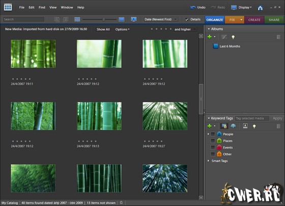 Забудьте о путанице с именами файлов, которые автоматически генерируются цифровой камерой. Теперь все фотографии упорядочиваются в одном централизованном месте. Фотографии можно организовать с помощью меток (ключевых слов), которые помогают классифицировать целые группы фотографий. Приложение также позволяет мгновенно найти нужную фотографию, независимо от размеров коллекции.