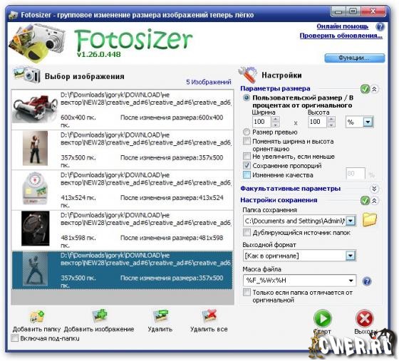 Программа Fotosizer предназначена для пакетной обработки графических изображений, а именно изменения их размеров. Программа позволяет за раз обрабатывать сразу большое количество картинок (целые директории), поддерживаются .JPG, .JPEG, .PNG, .BMP и .GIF форматы.