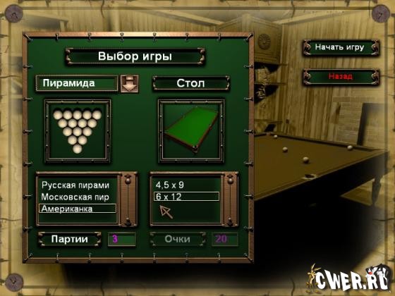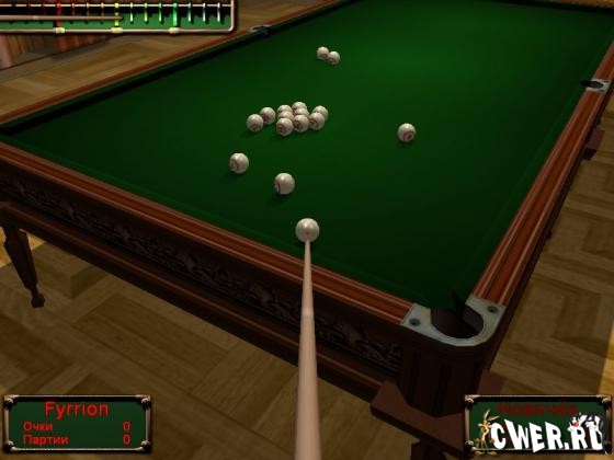 Трёхмерный симулятор бильярда, дающий Вам полное ощущение реальности. Большое количество игр, красивая графика, реалистичное движение шаров – вот лишь некоторые особенности этого бильярда. Вы можете играть с компьютером на трёх уровнях сложности, с партнёром на одном компьютере или по сети. Для каждого типа игр предусмотрены отдельные столы. Столы, шары и кий сделаны в соответствии с их реальными размерами. В игре реализован специальный режим трассировки движения шаров.