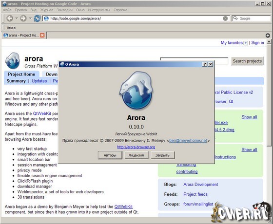 Arora — кроссплатформенный браузер с открытым исходным кодом, использующий WebKit как браузерный движок, написанный с использованием Qt. Браузер включает в себя минималистичный интерфейс, использование вкладок, простой журнал посещений, закладки и возможность установить пользовательскую таблицу стилей.