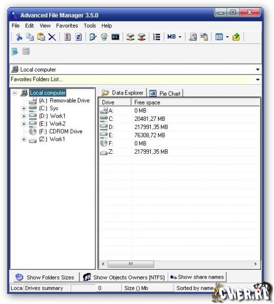 Advanced File Manager - файловый менеджер, который призван на замену стандартного проводника Windows и обладающий рядом дополнительных функций. С помощью этой утилиты вы сможете легко и быстро управлять содержимым ваших дисков, анализировать занятое дисковое пространство с отображением результата в виде круговой диаграммы, а также создавать детальные отчеты с возможностью сохранения в текстовые форматы.