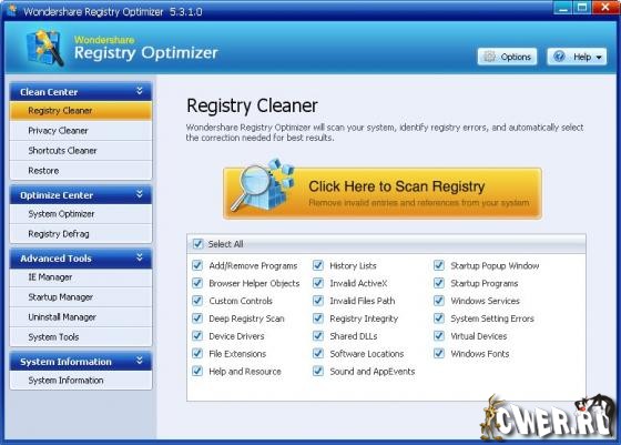 Wondershare Registry Optimizer - программа которая поможет вам в чистке и восстановлении системного реестра Windows. В процессе работы программа сканирует реестр и удаляет некорректные или устаревшие записи, тем самым, ускоряя работу Windows и избавляя её от разного рода ошибок. Среди дополнительных возможностей можно отметить: дефрагментацию реестра, создание списка ошибок, которые программа должна игнорировать, менеджер автозагрузки, деинсталяция приложений.