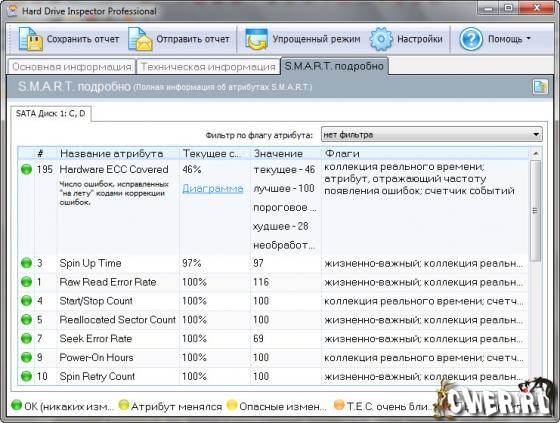 Используя технологию S.M.A.R.T., программа осуществляет наблюдение за текущим состоянием различных жизненно-важных параметров, описывающих надежность и производительность диска. Программа анализирует эти данные и предупреждает пользователя, когда параметры указывают на критическое падение надежности винчестера. Это во многих случаях позволяет предотвратить потерю информации.