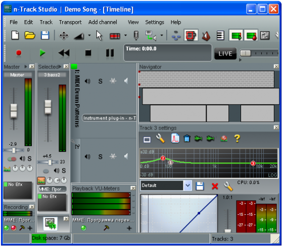 n-Track Studio поможет вам превратить ваш компьютер в домашнюю звукозаписывающую студию. Программа представляет полнофункциональную многотрековую аудиостудию, позволяющую в домашних условиях создавать свои собственные профессиональные музыкальные композиции. Вы сможете записывать и воспроизводить огромное число аудио и MIDI треков одновременно, накладывать всевозможные эффекты на каждый трек, работать с каналами и т.д. Кроме стандартных эффектов (Reverb, Compression, EQ, Echo, Auto volume, Pitch Shift и Chorus), программа позволяет подключать DirectX и VST 2.0 плагины от сторонних разработчиков. N-Track Studios может работать с любыми стандартными или многоканальными 16 и 24-битными звуковыми картами.