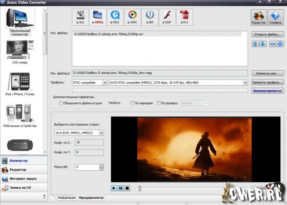 Axara Video Converter - комплексная программа специально созданная для работы с видеофайлами. Конвертирует в любой существующий формат. Кроме стандартных возможностей конвертации, работает с Sony PSP, iPod, Creative, Microsoft Zune и т.д. Имеется возможность закачки с YouTube, Google, YAHOO!, MySpace, AOL, CollegeHumor, metacafe и закачки непосредственно в iPod. И еще одна интересная возможность: благодаря новой технологии 2PassEncoding позволяет сконвертировать DVD-фильм в стандартный XviD MPEG4 без потери качества.