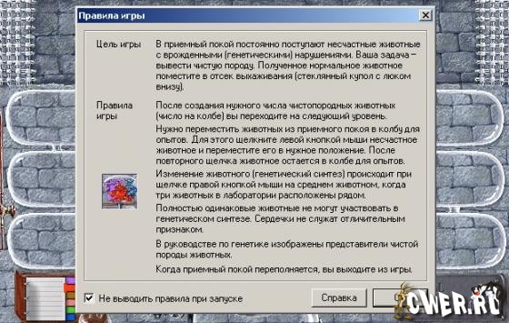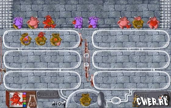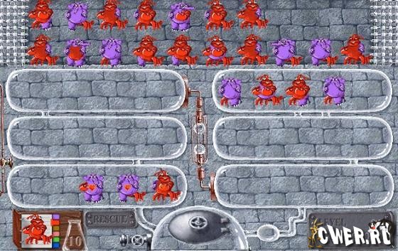 Весьма сложная логическая игра. Ваша задача заключается в восстановлении истинного вида различных животных. Проще говоря, в вашем распоряжении имеется постоянно увеличивающееся число мутантов, которых надо превратить в нормальных особей. Ваша задача - перенести неправильное животное из "приемного покоя" в колбу для "опытов", причем не одного, а вместе с двумя подходящими по "строению".