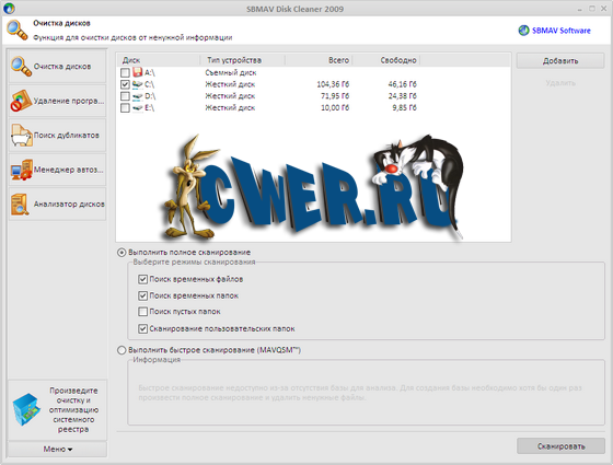SBMAV Disk Cleaner - мощная утилита для очистки дисков от различного информационного мусора, который не содержит никакой важной информации, загромождает диски, загружает систему и снижает производительность всего компьютера. С ее помощью можно производить поиск и удаление временных файлов и папок не только системы, но и иных программ, производить поиск неверных ярлыков, деинсталлировать программное обеспечение, отключать или удалять неиспользуемые шрифты, удалять ненужные Cookies, производить поиск дубликатов файлов. Также с ее помощью можно работать с пользовательскими файлами: выявлять и удалять устаревшие резервные копии и документы, производить поиск дубликатов файлов по различным параметрам, выявлять и удалять ненужные. Программа имеет дружественный интерфейс и проста в использовании.